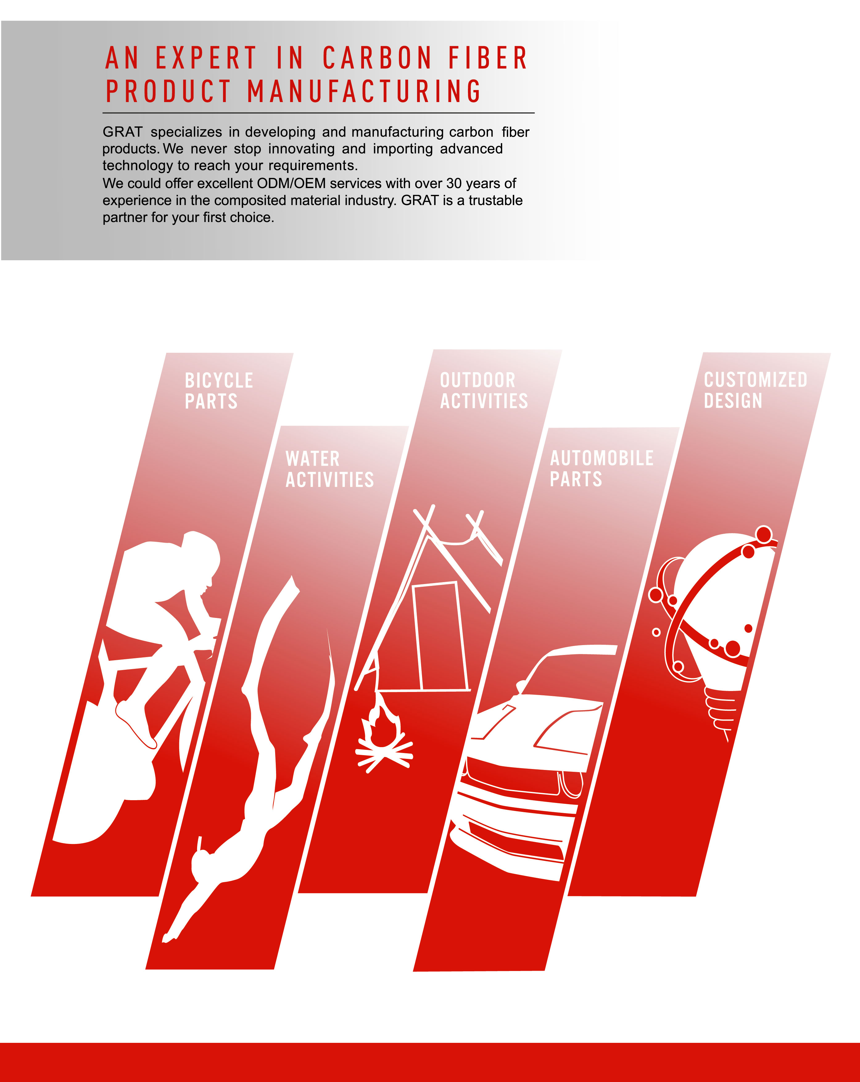在戶外運動與車用等各式領域的碳纖維產品皆可洽詢及評估,期望達成客戶的需求。